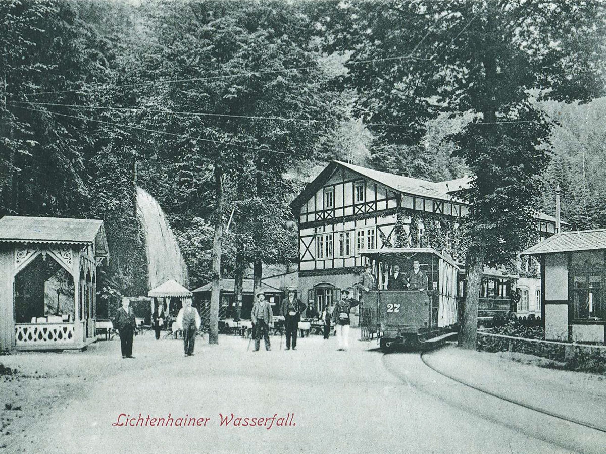 Kirnitzschtalbahn-raitiotie postikorttiin ikuistettuna n. vuonna 1920. Lichtenhainer Wasserfall -vesiputous toimii edelleen radan päätepysäkkinä.
